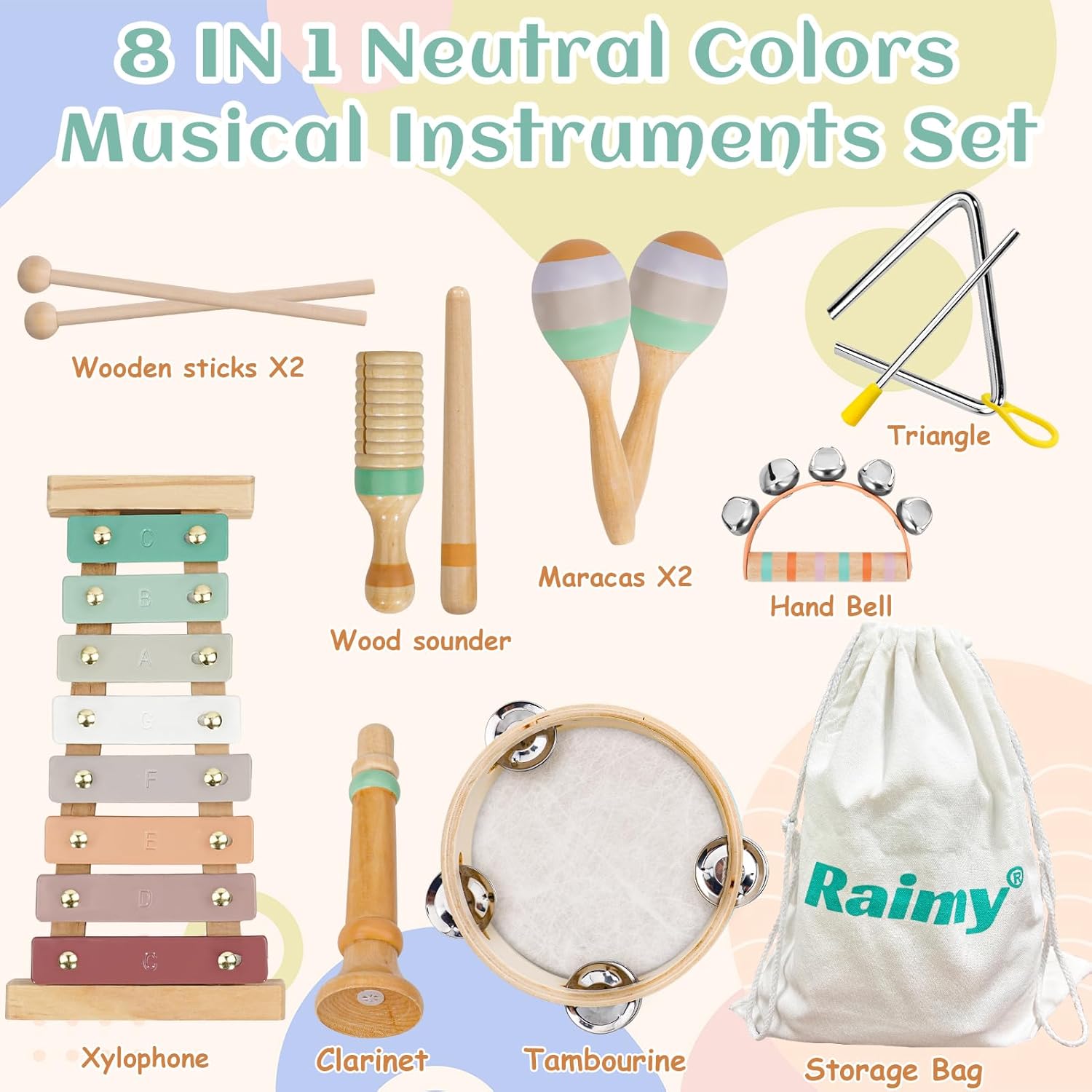 Raimy Musical Instruments Set - Neutral Colors Wooden Montessori Toys Percussion Music Modern Boho Xylophone Birthday Gifts for 1 2 3 Year Old Kids Baby Toddlers Boys Girls 3+ with Storage Bag