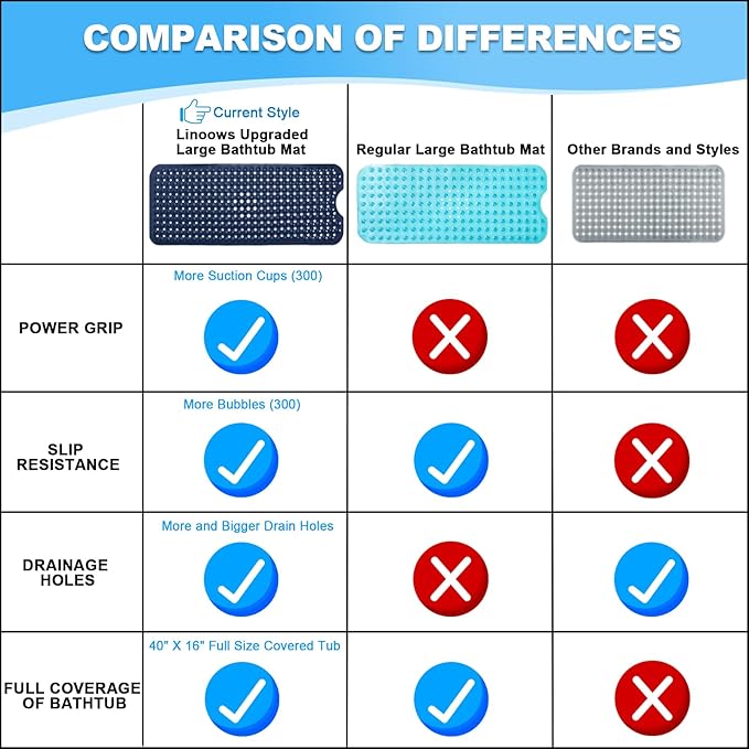 - STRONG GRIP: Linoows premium tub and shower mat upgrade comes with 300 high-strength and flexible suction cups, 30% more suction cups than other ordinary tub mats on the market, and stronger suction to help keep it in place on a smooth clean surface. Our bath mats are a great choice for the home, gym, spa, and more!