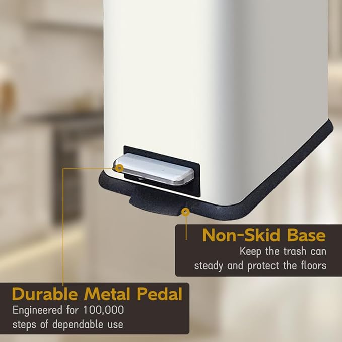 - Stable & Anti-Slip: Non-skid base keep your white garbage can firmly grounded, no matter the floor. This step on trash can is engineered to last over 100,000 steps.