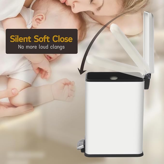 - Soft Close & Stay Open Lid: Equipped with a soft-close mechanism and a stay-open feature, white bathroom garbage can doesn't slam down and make noise.
