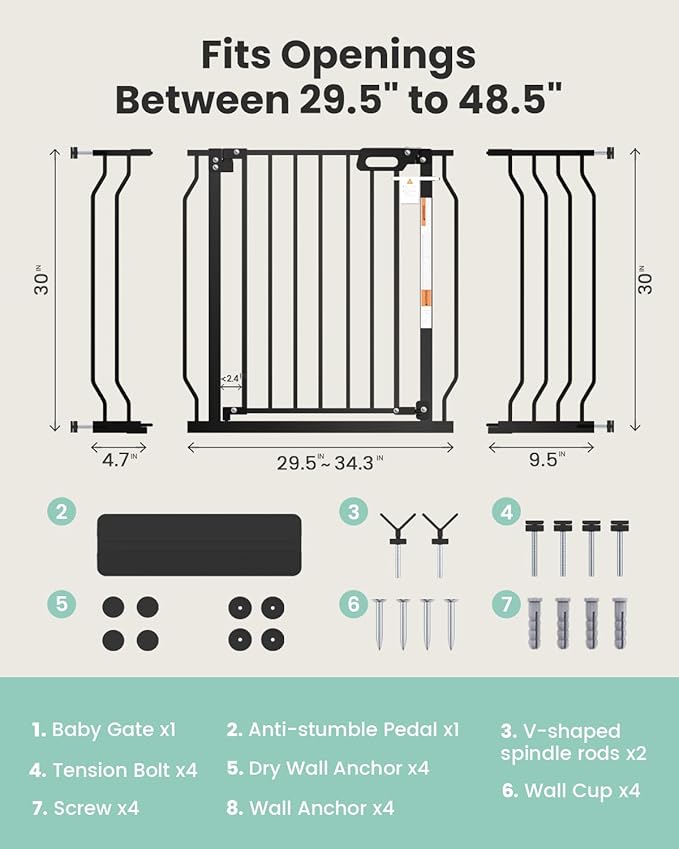 - 【Metal Baby Gate with Anti-stumble Pedal】The anti-stumble pedal, especially designed for the top of stairway baby gates, reduces tripping risks with its flat surface. Essential for homes with elderly or children, it ensures a snug gate-to-floor fit. Its seamless design maintains safety without affecting aesthetics.
