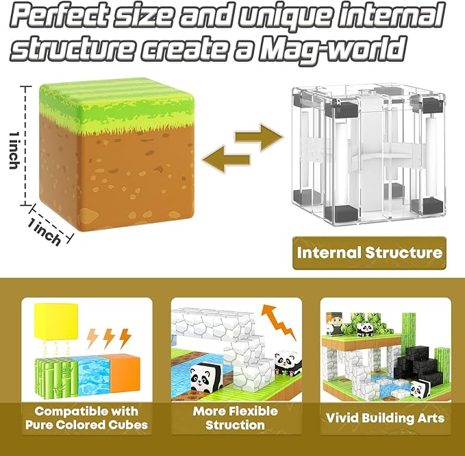 - 【PANDA MINE MAGNET WORLD CUBES】Imagine in a realistic panda park, watching adorable pandas play around you, feeling their warmth. What an exciting and desirable scene! We offer Toylogy magnetic blocks with panda theme, allowing you to build a realistic panda park with your boys or girls in your home! With magnetic toys unique and realistic printing designs, you can build various habitats for pandas, such as bamboo forests, grasslands, and rocky areas, making you feel like you're really in a real panda park.