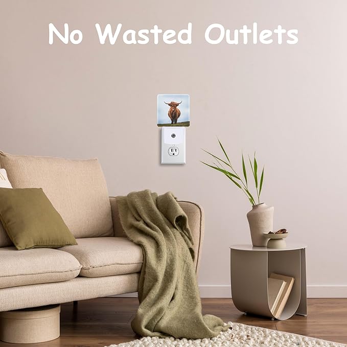 - 【Dusk to Dawn Sensor】This Scottish Highland Cows night light plug wall is equipped with a light sensor that automatically turns on at dusk or dim light and turns off at dawn or when there is sufficient light.Its smart design saves power and eliminates the need for manual switching