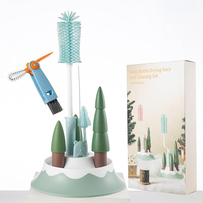 Chemimoso Baby Bottle Drying Rack and Cleaning Set, with Straight Silicone Baby Bottle Brush, Pacifier Brush, Straw Brush, Cup Lid Cleaning Brush, 2025 Xmas Holiday Surprise Gift for Newmom, Z Blue