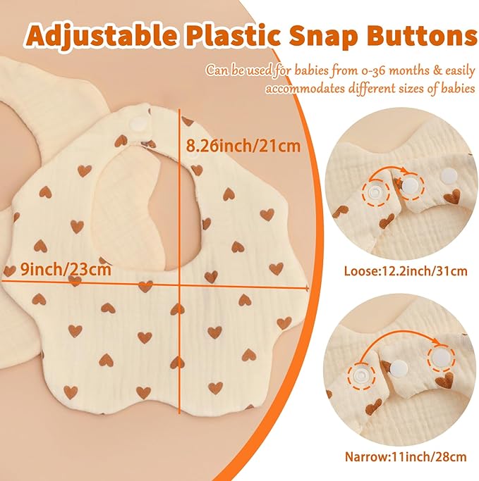 - Versatile and Practical: Our bibs are designed to be versatile and practical, suitable for various situations. With excellent water absorbency, they are ideal for managing drooling, feeding, and teething messes, keeping your baby clean and dry. The two adjustable buttons ensure a comfortable and secure fit for babies of different ages.