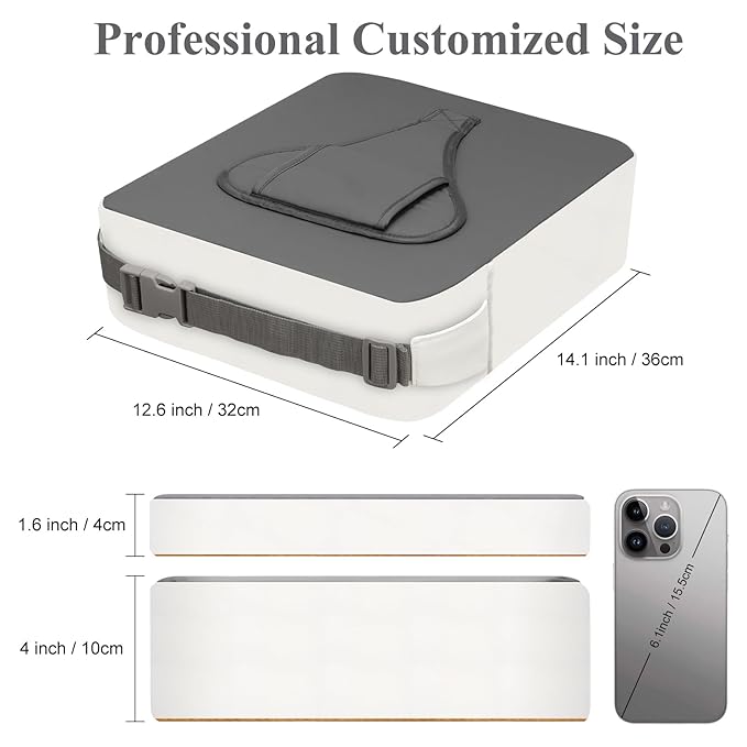 - 【Booster Seat Suitable Size】The baby booster seat has a backrest size of 14.1x12.6 x 1.6 inches and a cushion size of 14.1 x 12.6 x 4 inches, specifically designed for most dining seats. At the same time, the length of the bottom seat belt is appropriately increase, so the cushion can be better fixed on the most dining chair.