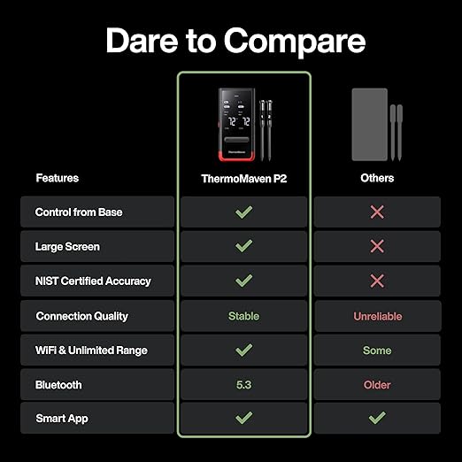 - Smart Display Base: Unlike other thermometers that require an app to function, the P2’s display base provides real-time readings and lets you set temperatures directly on the device. A smart app is also available, giving you the best of both worlds.