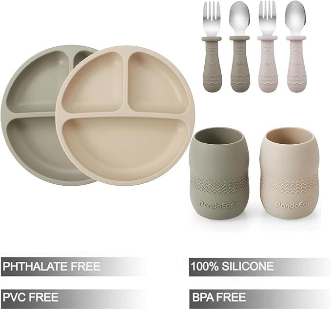 PandaEar Silicone Baby Feeding Set| 2 Pack Silicone Divided Suction Plate and 2 Pack Tiny Cup with 2 Spoons 2 Forks| Baby Led Weaning Supplies Self Feeding Eating Utensils (Silverware Set)