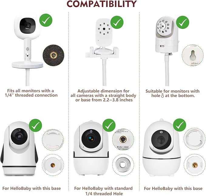 - Compatible Devices : GoodBaby, Nanit Pro Smart Monitor & Flex Stand, HelloBaby Monitor HB6550 pro/HB65/HB66/HB248/Eufy/Vtech VM901/VAVA/ANMEATE SM935E/iFamily SM650; Other Cameras with 1/4 Thread Connection like Nanit Pro/Infant Optics DXR-8/Vtech VM924/ANMEATE SM24 GoodBaby, Nanit Pro Smart Monitor & Flex Stand, HelloBaby Monitor HB6550 pro/HB65/HB66/HB248/Eufy/Vtech VM901/VAVA/ANM… See more