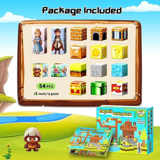 - 【Magnetic Cube Kit】 Including 54pcs magnetic cubes (1x1x1 Inch),instruction manual,Storage bag. Only use food-grade ABS plastic and natural water-based paint with smooth edges and corners, to ensure it is safe and easy for toddlers ages 3+ to operate . Children can combine magnetic toys with diverse elements according to the creative instructions, create various buildings and games scenes,ideal toys for kids, especially boys aged 3-7.