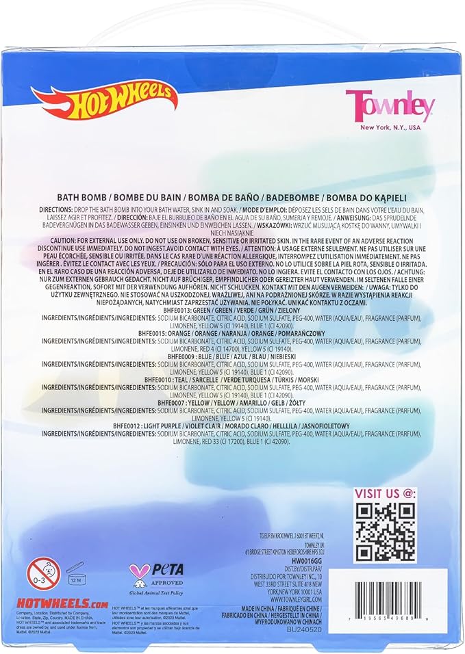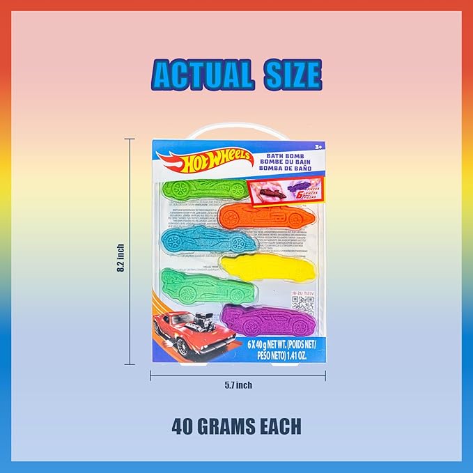 - SET INCLUDES: 6 40g bubblegum scented, molded bath bombs. Each bath bomb is molded into different Hot Wheels cars.