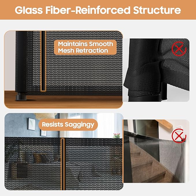 - 【Fiberglass Reinforced】The upgraded retractable baby gate now includes fiberglass support strips, which not only prevent kids and pets from going under the mesh, but also reduce wrinkling of the mesh. The retractable mesh gate expands smoothly without getting stuck, making it smoother and more effortless to use.