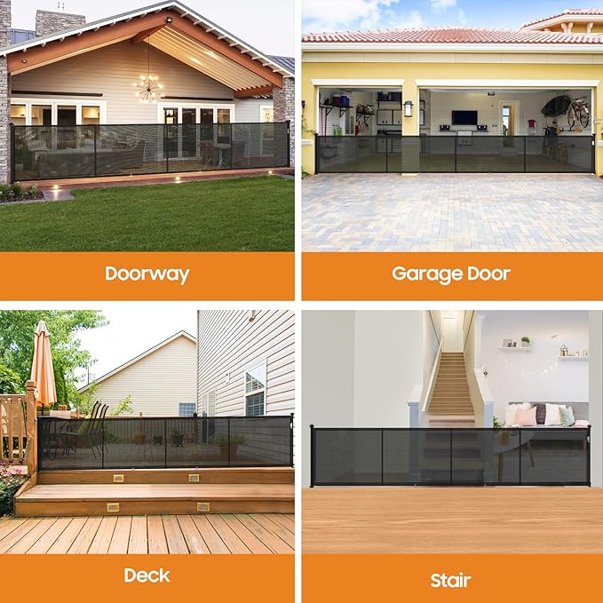 - 【Suitable for Indoor and Outdoor Use】This retractable gate can be used in a variety of indoor and outdoor settings, such as open-concept kitchens, stairways, entryways, bedrooms, living rooms, around fireplaces, on patios, decks, in garages, and other restricted areas. Keeping your children and pets away from hazardous locations.