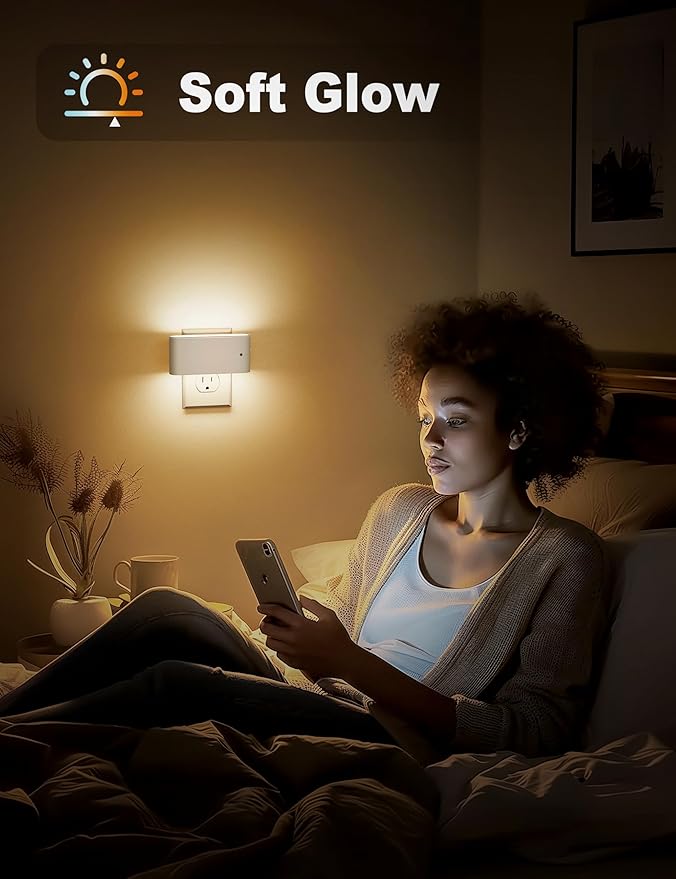 - AUTO ON OFF: Equipped with smart light sensing technology, this night light automatically turns on or off according to ambient brightness, providing convenience and energy efficiency.