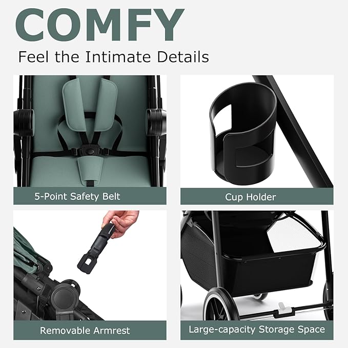 - HIGH QUALITY MATERIALS FOR LONG TIME SAFETY USE: We use high quality iron pipe for the main structure to make sure our baby stroller is durable and strong enough when using. The oxford material is safe and non-toxic and also ensures the comfort use experience. Our pram can hold a child from 0 to 3 years and it also includes 5-point safety belt which can ensures safety while fitting baby's body.