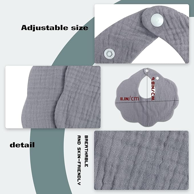 - Versatile and Practical: Our bibs are designed to be versatile and practical, suitable for various situations. With excellent water absorbency, they are ideal for managing drooling, feeding, and teething messes, keeping your baby clean and dry. The two adjustable buttons ensure a comfortable and secure fit for babies of different ages.