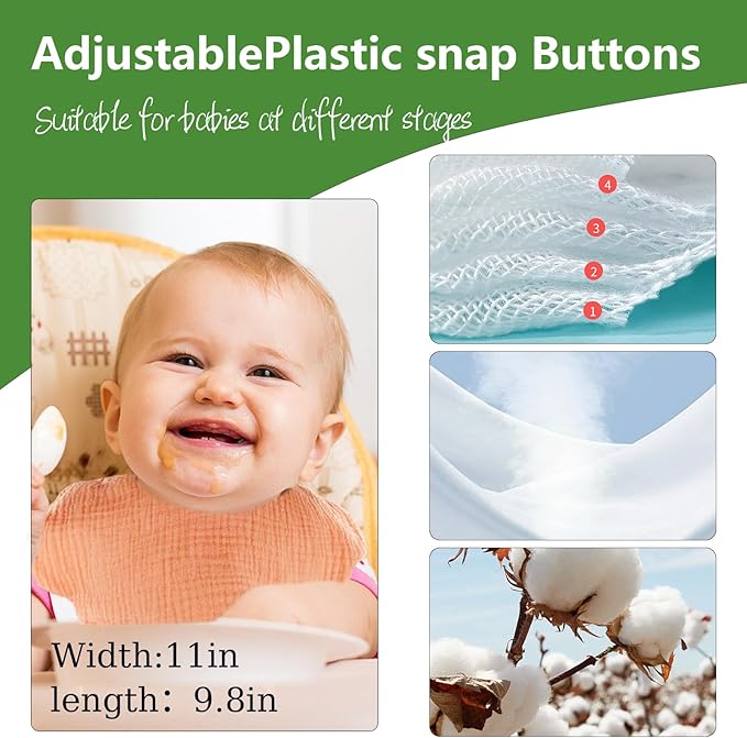 - Premium Craftsmanship: Our baby bibs are meticulously handmade with care and precision, using 4 layers of 100% muslin cotton. This premium quality material ensures superior softness, breathability, and durability, making them perfect for your little one's delicate skin.