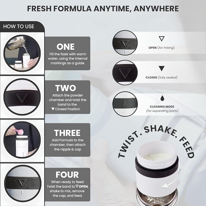 - KEEPS WATER WARM & FORMULA FRESH: MIX WHEN READY - The insulated stainless steel baby bottle is double vacuum-sealed to keep water warm up to 8 hours and formula fresh in a separate formula dispenser attached above. Simply twist to release the powder, then shake to mix, and feed your baby warm, fresh formula.