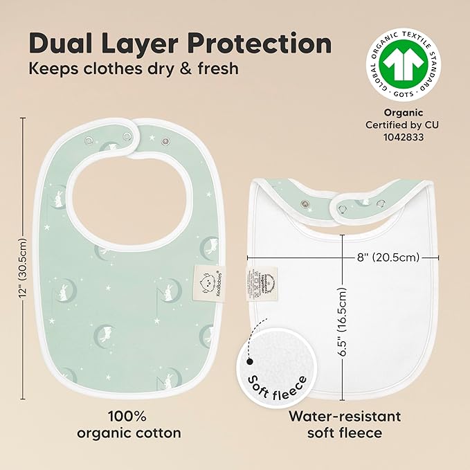 - Super Absorbent - Our organic baby boy and girl bibs are made with 100% organic cotton (GOTS-certified) and backed with water resistant fleece for added absorption. This dual layer design helps to keep your baby clean and fresh all day long. Suitable for newborns, infants, toddlers, heavy droolers and teething babies.