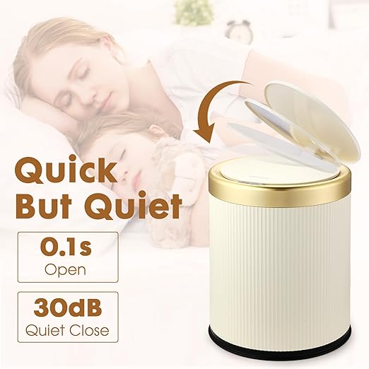 - 【 Modern & Functional 】 This bathroom trash can features a modern striped barrel body with gold trim. 5.31in large opening design, one button for long-opening, prevent spills and lid banging, easy to dump. 9.25x10.8in motion sensor trash can bathroom size fits well in bathrooms, bedrooms, living rooms, offices, and more. And the garbage can sensor capacity of 2.8 gallons meets everyday life's needs effectively.