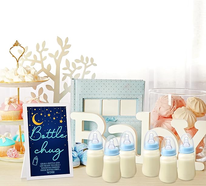 - Nice Baby Shower Games Sets: you will receive 1 piece of wooden moon and star theme bottle chug game wooden sign and 18 pieces of baby bottle for baby shower games in blue,19 pieces in total, which are suitable for your baby shower parties and enough for you to share with others