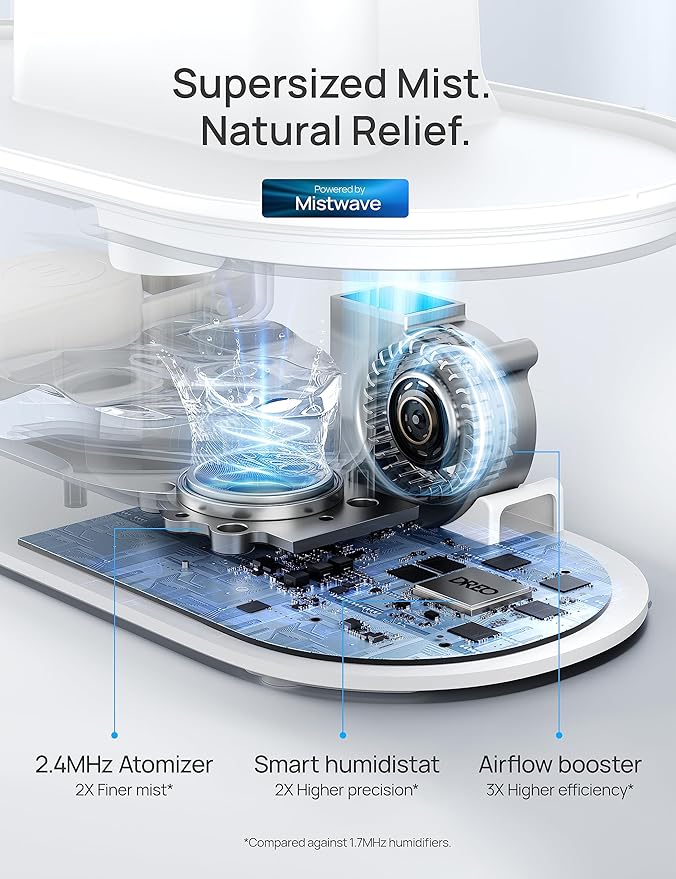 - Larger mist, faster relief: Powered by Dreo's Dual-intake design, this humidifier creates a supersized mist 3 times larger than most air humidifiers, bringing faster dry air relief and helping you breathe easy and healthy