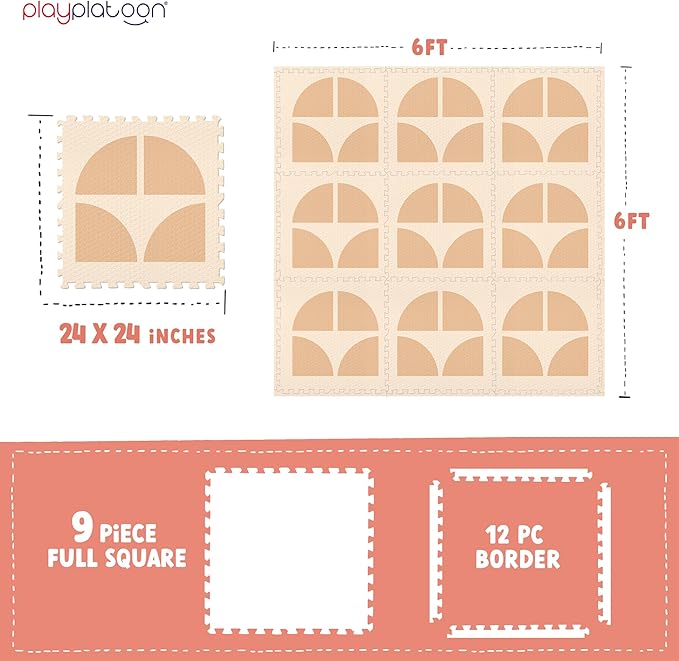 Play Platoon Large Kids Mats for Floors, Non-Toxic, 9 Tile 72 x 72 inch, Extra-Thick Interlocking Tiles, 24 x 24 in. Puzzle Mat Pieces with Border, Neutral Playmat Rug for Toddlers & Children