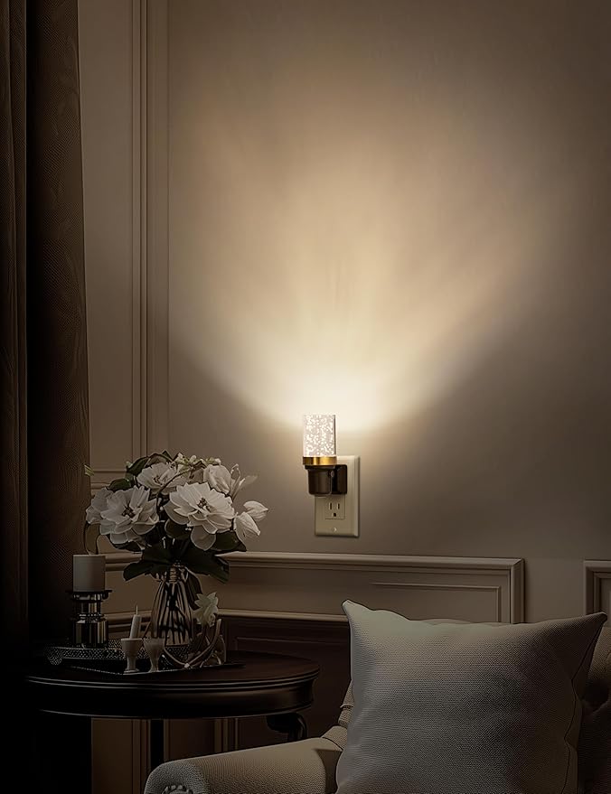- STYLISH & DECORATIVE DESIGN: Modern bubble cylinder night light with a gold and black finish adds an elegant touch to any room, making it a perfect decorative LED night light.