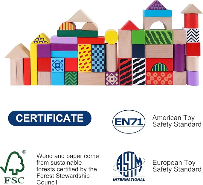 - 【Safe, Environmentally, and Sustainable】: Offelec 50-Pcs Large Building Blocks Set is made from durable and sustainable wood,ensuring long-lasting use and providing a safe playtime experience for your child. All the materials,including wood,paper,painting,etc.,pass the toy safe test of EN71(European Toy Safety Standard)and ASTM(American Toy Safety Standard)