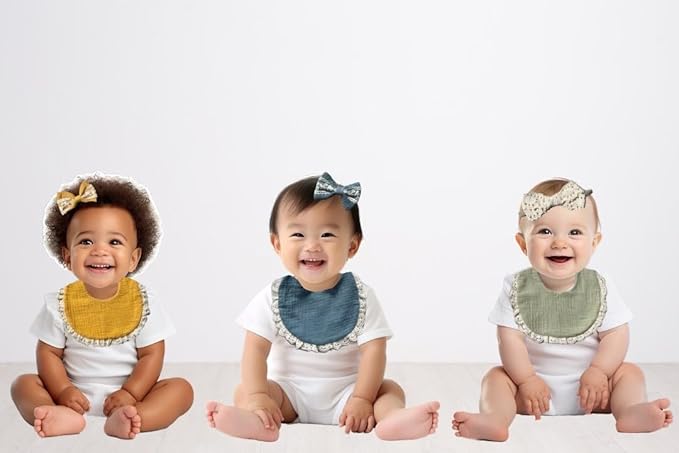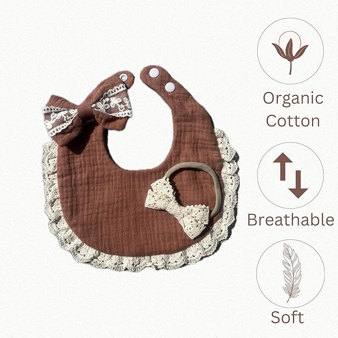 - Product Material: 100% High Quality Muslin Cotton with Lace accent and nylon headband on bows. Absorbent Muslin will keep the baby dry and comfortable from drooling or eating messes. All items in the set are breathable and lightweight and will be super soft on baby’s gentle skin. Due to the lace accent, hand washing is recommended.