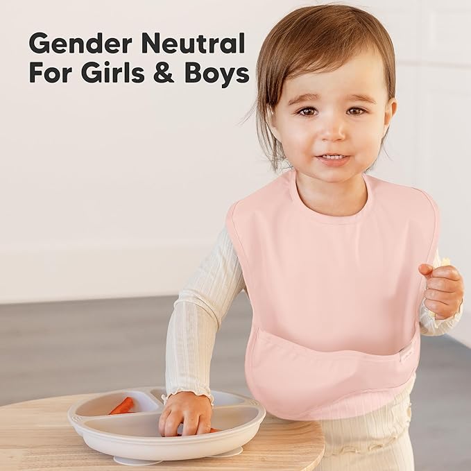 - Covers Upper Chest and Shoulders - Your baby can now enjoy self-feeding without soiling their clothes with the mess-proof bibs. This toddler bib for baby boys and girls comes with a wide food catcher pocket holds fallen food crumbs and purée spills.