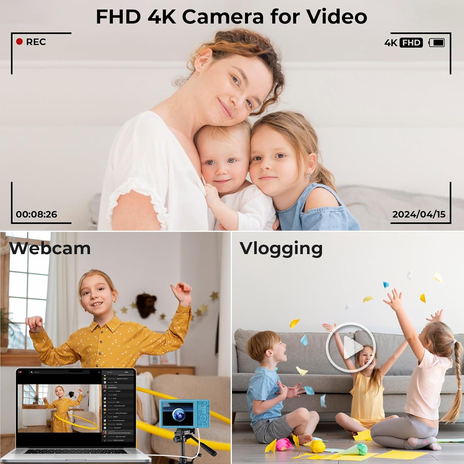 - 【4K Ultra FHD & 44MP Digital Camera】The 2024 upgraded kids digital camera offers a 44MP CMOS sensor for high-resolution photos and 4K Ultra FHD video recording.Features a 2.8-inch IPS screen for easy viewing and framing shots. Includes a 64GB memory card for ample storage, making this digital camera for kids 10-12 and teens great for capturing everyday moments and adventures.