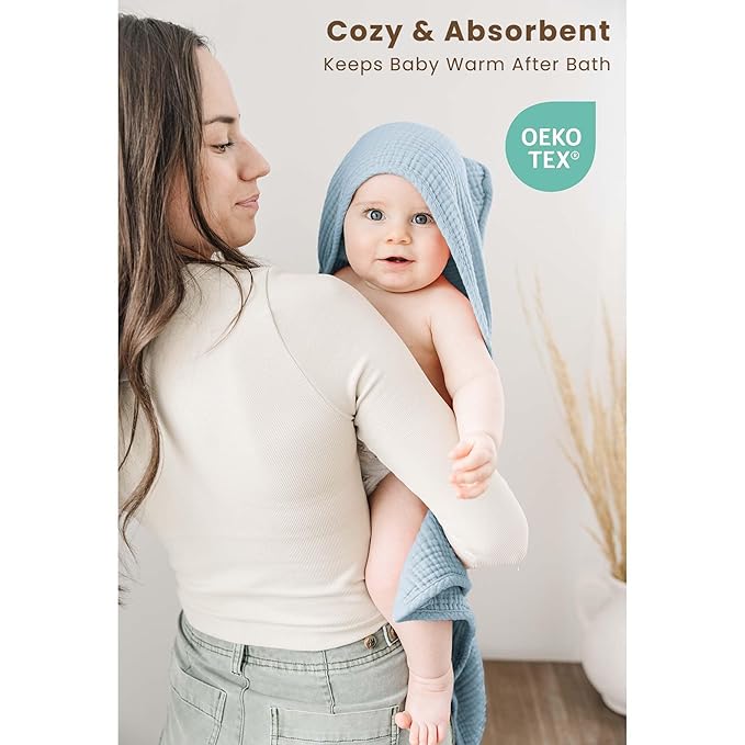 - Soft and Absorbent Material: Baby towels are made from soft and absorbent 100% cotton(muslin) materials for a gentle touch on a baby's delicate skin. The baby bath towel provide a quick and easy way to cover and dry a wet baby