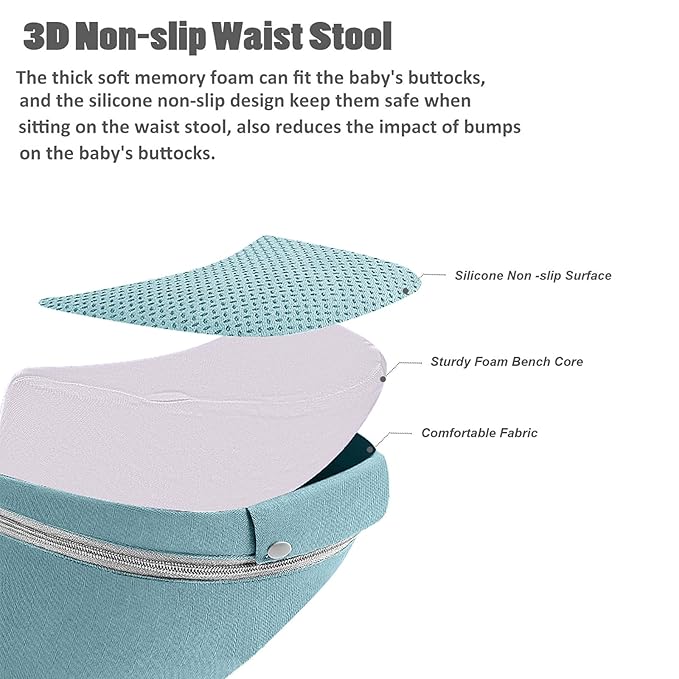 - Ergonomic Hip Seat: The waist stool maintains the baby's M-shape during carrying, helping their skeletal development. The wide waistband make the hip seat to fit snugly against the parent's waist, helping to share the weight during carrying baby. The inward sloping angle of the hip seat keeps the baby close to the parent's body comfortably and reduces bumps and shaking when parents walking. Besides, it make baby feel safety in their arms.
