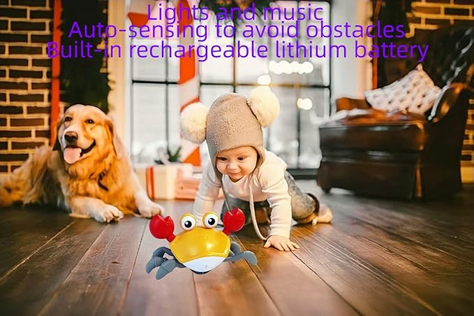 - Crawling Crab Baby Toy: The crab durability for a long time,Long battery usage longevity ,The shell has high strength, moves quickly, slides sideways like a real crab, and makes funny sounds and bright lights. When it approaches an obstacle, its sensors reverse direction. The crab is a built-in rechargeable battery that can be recharged over and over again.