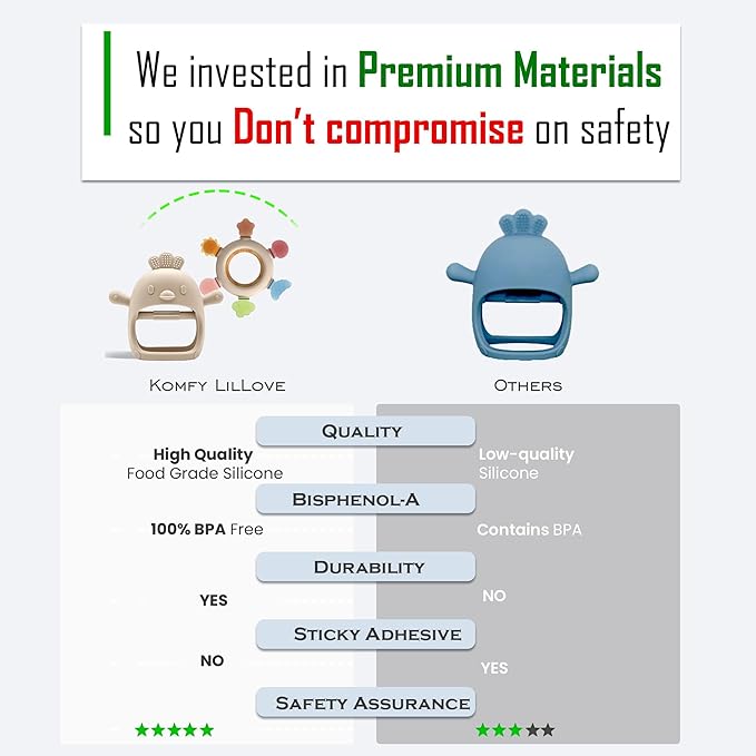 - Supports Natural Teething Development: If your baby is drooling more than usual or feeling irritable, they might be starting to teethe. Komfy LilLove silicone baby teether for 0–6 & 6–12 months satisfy their natural chewing reflex, helping ease gum pressure and provide comfort. The textured surfaces encourage healthy oral development as new teeth emerge.