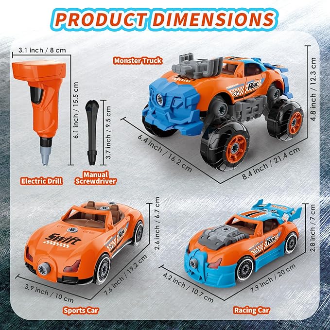 - πγ3-in-1 Vehicle Styles]γThe take-apart toy set includes 3 different vehicle designs: monster truck, race car, and convertible. A great car building kit, kids can unleash their imagination by assembling their favorite vehicle style or even creating their own unique designs.