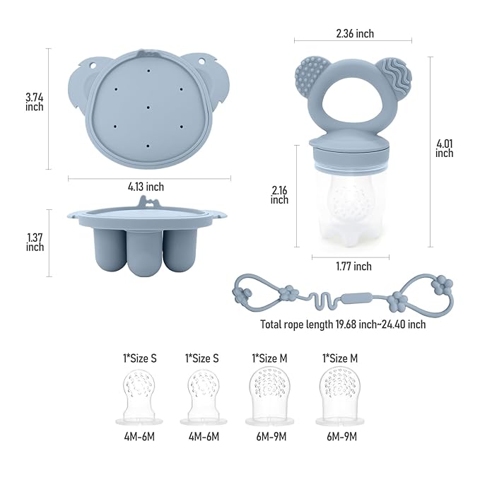 - Food Grade Silicon Feeder Set: Free of BPA, PVC and Phthalate. Included 2× koala food feeder, 1× koala Freezer tray, 1×toy strap, 3 sizes of pacifiers, fits the chewing needs of babies in different months.