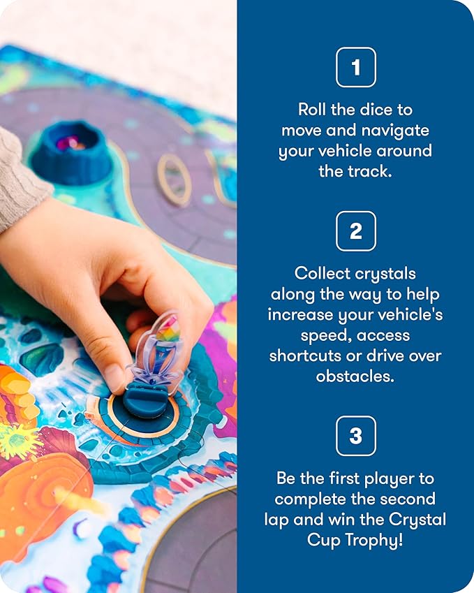 - HOW TO PLAY: Players take turns rolling the dice and racing their vehicle around the track. Racers collect crystals to power up their vehicle and plan which paths to take to get ahead. Power-ups can be used to take shortcuts, drive over obstacles, or increase their engine power. Racers can also place obstacles in the way of their opponents to slow them down. Be the first racer to complete two laps around the track and win the Crystal Cup Trophy.