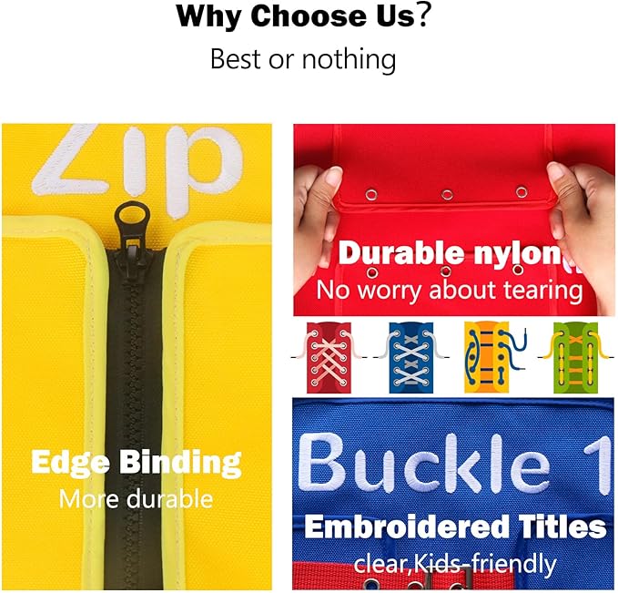 - Durable & Prime Material Makes Montessori Busy-Board Last Long - Fine Motor Skills toys toddlers are made of Nylon, withstand daily use in a busy classroom or daily supplies. Each skill accessory is very durable by plenty of tests. Embroidered titles, durable, kids-friendly and Not Easy to FADE and SNAP.