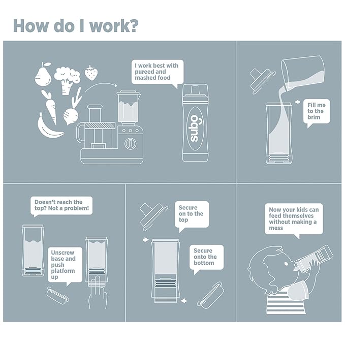- AUTOMATIC PLATFORM: The Subo food bottle is the perfect feeding solution for young children, starting at just 4 months old with rice cereal or level one purees using the 5mm spout (only included in the Starter Set). This bottle allows children to easily sip and enjoy their food through a soft silicone spout. The platform inside the bottle automatically moves up as the child consumes the food, ensuring they get every last bit without any struggle. This makes mealtime fun and stress-free.