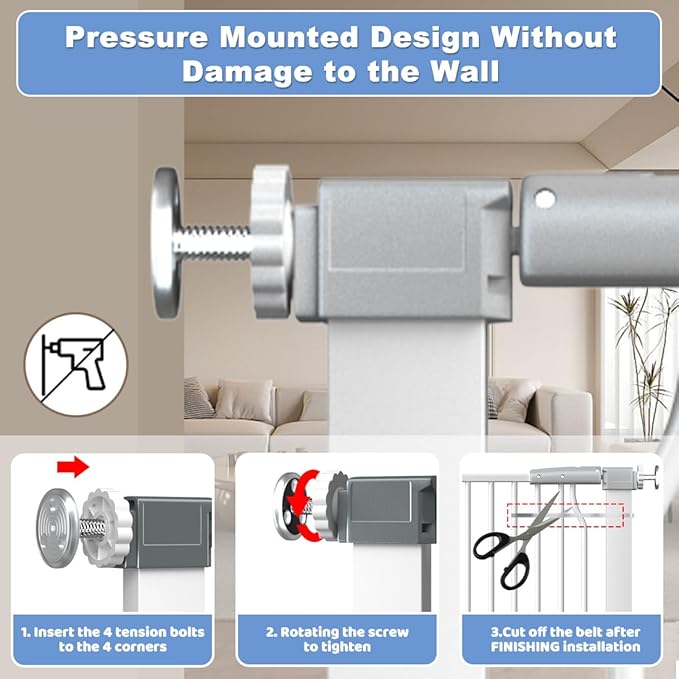 - 【Pressure Mounted Tall Dog Gate】This dog door is used by pressure mounted installation.Our extra wide extra tall cat gate comes with 4 adjustable pressure bolts,add pressure bolts on the bottom and top sides of the pet gate for cats without tools or drilling.It won't cause damage to your door or wall.Please don't cut off the plastic ties before installation.