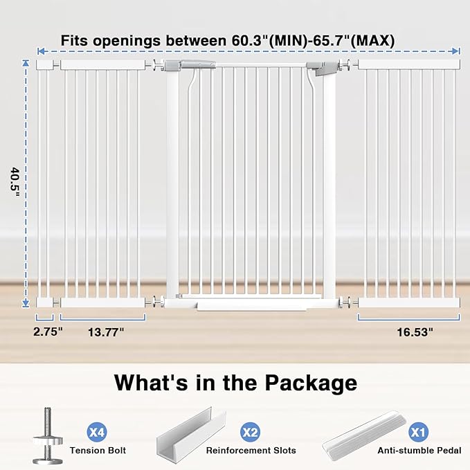 40.55" Extra Tall Baby Gate for Stairs-60.3"-65.7" Wide 1.37" Ultra Narrow Spacing Extra Wide Pet Cat Gate Dog Gate-Auto-Close Pressure Mounted Dog Door for Pets and Kids,White