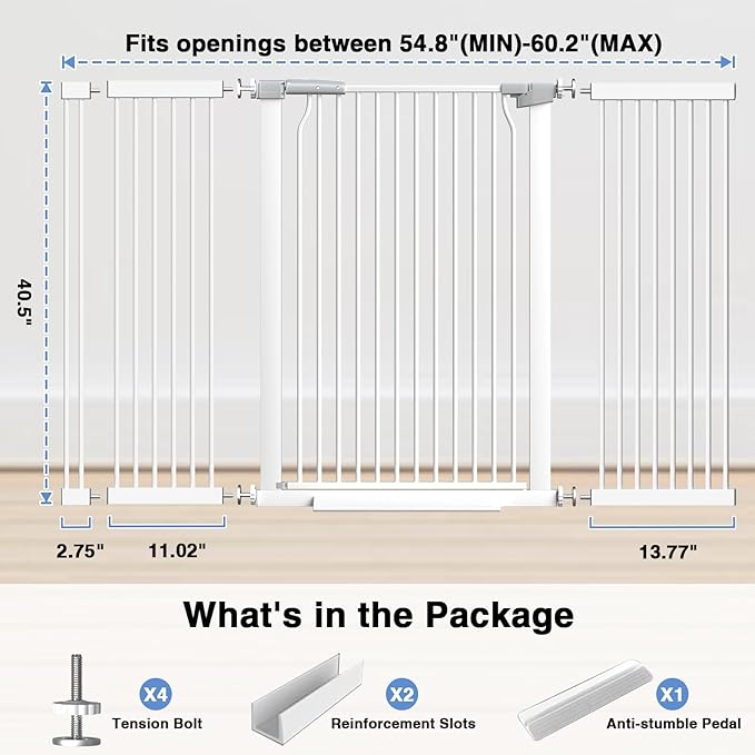 40.55" Extra Tall Baby Gate for Stairs-54.8"-60.2" Wide 1.37" Ultra Narrow Spacing Extra Wide Pet Cat Gate Dog Gate-Auto-Close Pressure Mounted Dog Door for Pets and Kids,White