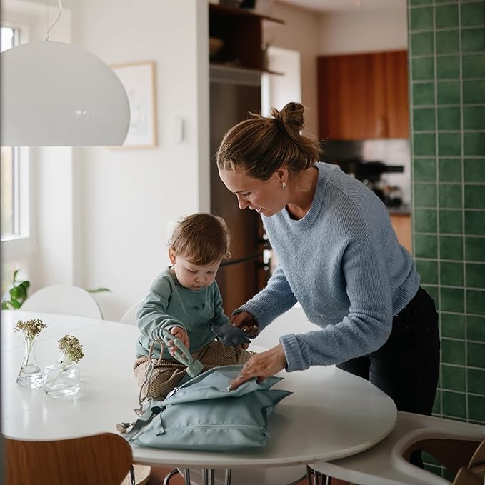 - Comfort on the Go: Featuring a zipper closure and machine washable, water resistant material, mushie wet bags are designed to help tackle messy situations on the go. The handles include a snap closure to easily hang or attach to a stroller.