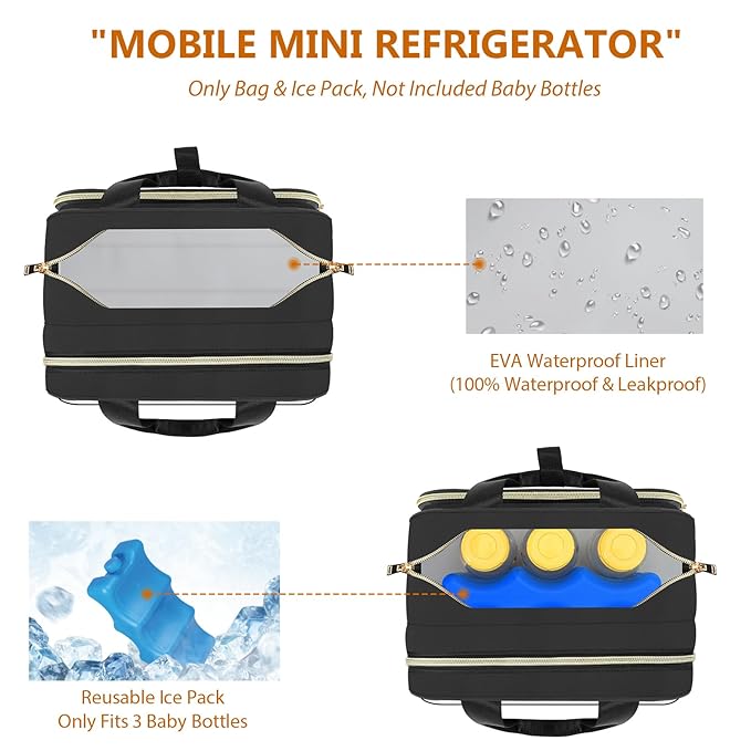 - Portable Baby Cooler Bag: The breastmilk cooler bag is made of waterproof & leakproof EAV lining with an ice pack, just like a ”mobile mini -fridge” keeps breastmilk or fomula fresh for hours. It's a waterproof liner to prevent leakage and fits 3 baby bottles up to 9 oz or 3 baby food storage jars up to 8oz.