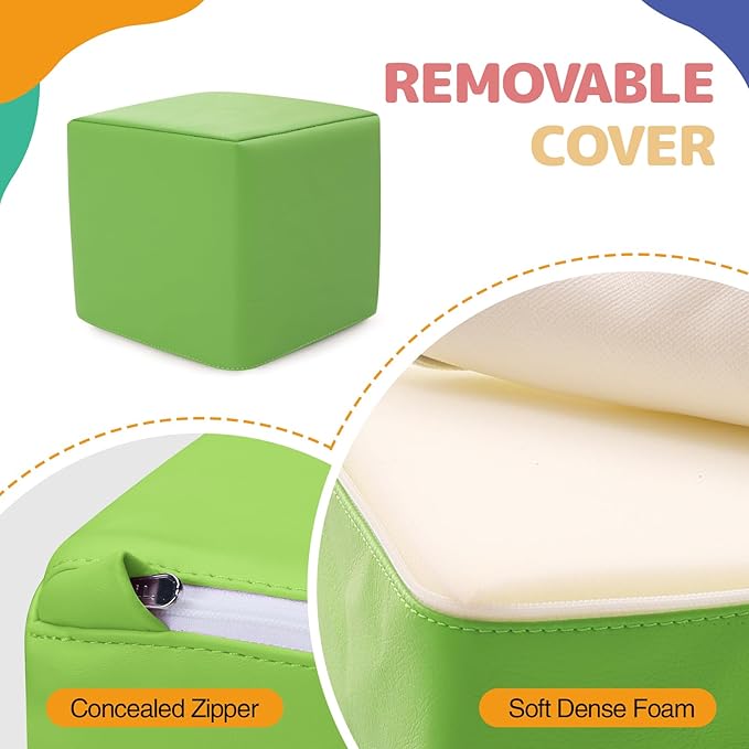 - Easy Maintenance: The surface material of blocks is PU leather. Each foam block features a removable, washable fabric cover, ensuring cleanliness after hours of play. Designed for durability, they quickly regain their shape after being compressed during shipping, ready to create a vibrant toddler zone filled with colorful softscape adventures