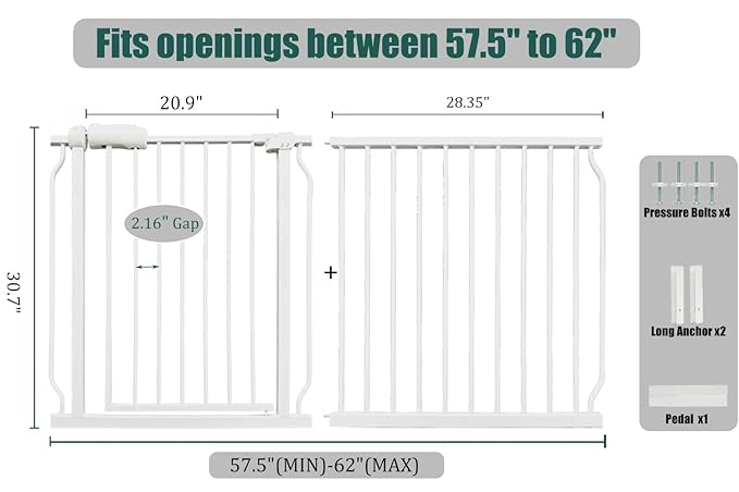- 【Adjustable Wide】This extra wide baby gate for stairs fits 57.5-62 inch wide openings. Perfect as a pet gate for dogs or child gates for doorways. You have the flexibility to install it, whether it's on the stairs, doorways or kitchens