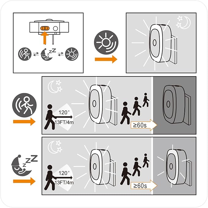 - Light Sensor and Motion Sensor Mode:In Light Sensor Mode, the night lights plug into wall automatically turns off at dawn and turn on at dusk, making it ideal for bedroom that needs continuous low lighting at night. In Motion Sensor Mode, the bright night light will auto on in the dark and then auto-off after 60 seconds of inactivity, suitable for areas where constant lighting is unnecessary. Push the top slider to choose the mode you like.