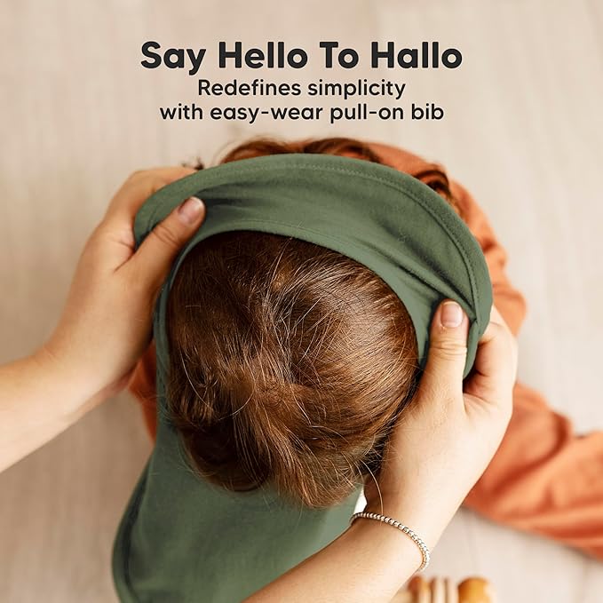 - For Active Infants, Toddlers - The Hallo Baby Teething Bib features a pullover lap shoulder design—no snaps, easy to put on. Just slip it over the baby's head like a t-shirt, and you’re all set. It stays on all day, even for the most active toddler.